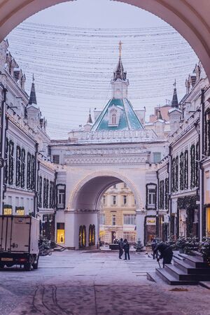 MOSCOW, RUSSIA - JANUARY 31, 2020: Decorated with Christmas decor red square in Moscow near GUM at night in winter