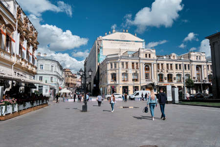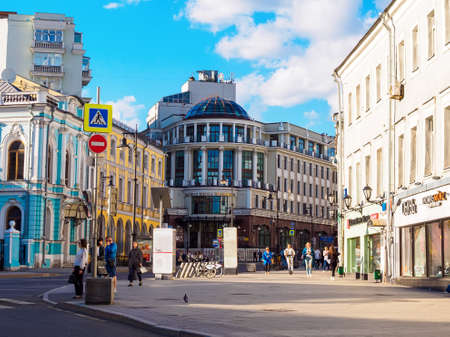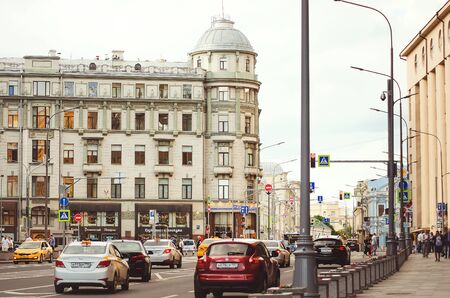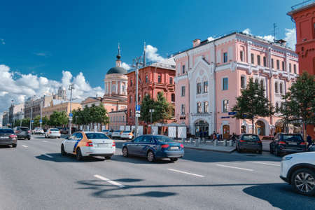 Moscow, Russia - 23 Jul 2020: General landscape view at tradition Moscow architecture. City life on the central streets of the city. The citizens go on their own business. Automobile traffic.