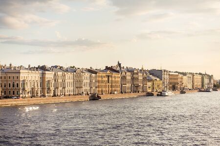 St. Petersburg, Russia - August 2021 River channel with boats in Saint-Petersburg. Summer. High quality photo