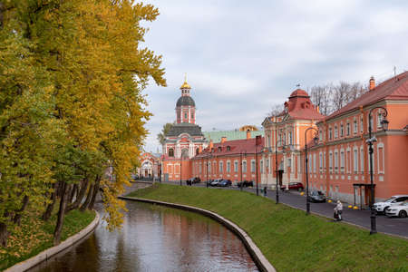Saint-Petersburg, Russia – October 10, 2021: View of Saint Alexander Nevskiy Lavra with Annunciation Church and Prosphora housing on The Monastyrka River Embankment