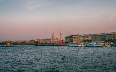 view of the Neva river and the city of Saint Petersburg from above, boats on the water, buildings, embankment at sunset