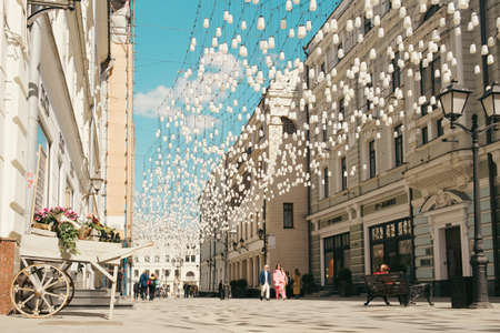 View of the pedestrian street in the center of the capital of Russia. City walking street decorated with white lanterns. Moscow, Russia - 05.21.2022