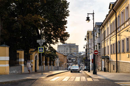 Moscow, Russia - August 29, 2021: view of Zvonarsky Pereulok street in Moscow city at sunset. The lane got its name from Kremlin bell ringers settlement located here in the 15th - 17th centuries