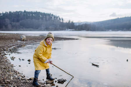 Happy little boy with Down syndrome looking at camera outside by lake in winter.