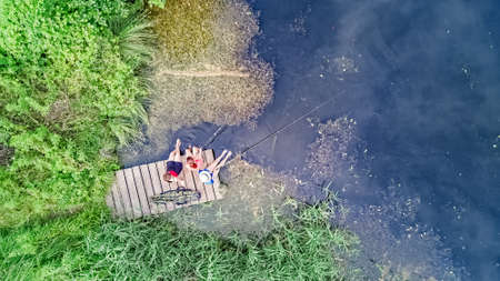 Happy family and friends fishing together outdoors near lake in summer, aerial top view from above