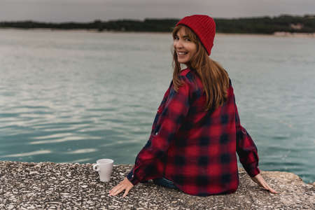 Beautiful woman enjoying her day in the lake with a mug of hot coffee