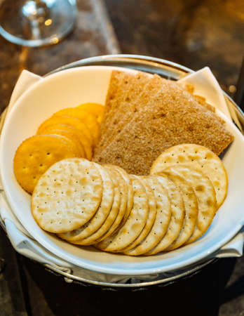 Breakfast serving of cream crackers. Selective focus points. Blurred background