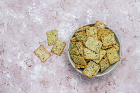 Crackers with rosemary and dill. Culinary background. Space for text.