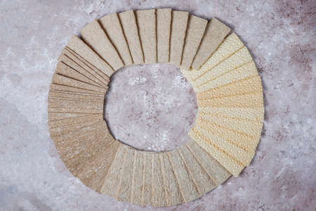Different types of crispbread.Healthy food concept.White brown background.Top view