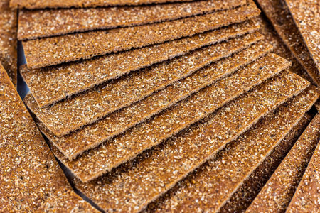 Crispy thin rye bread stack for eating as a food background.