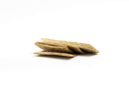 A pile of dry wheat light thin slices of dry diet bread on a white background isolated