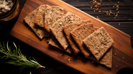 Crispbread crackers arranged on a rustic wooden background, illustrating concepts of healthy food, fiber, and wholesome diet snacks