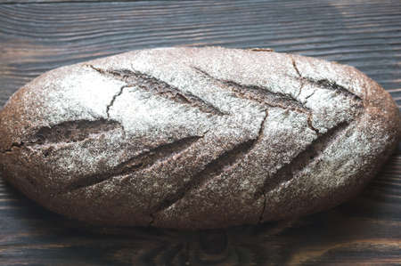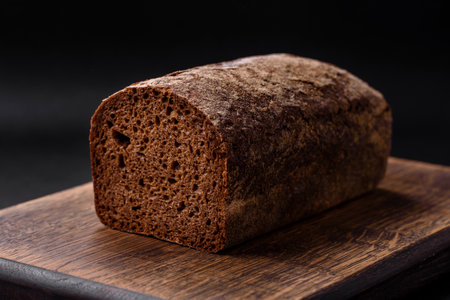 black homemade rye flour bread, close-up of food on kitchen cutting Board, making lunch of crispy bread