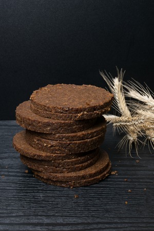 Stack of whole grain crispbread. Healthy snack food options, rich in fiber, on a rustic dark wooden background