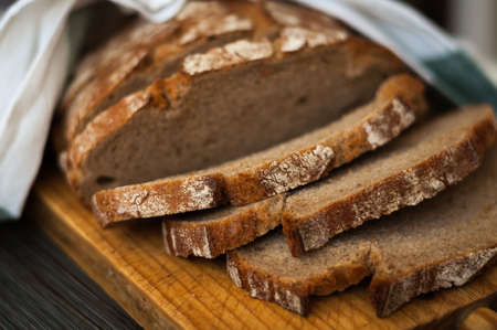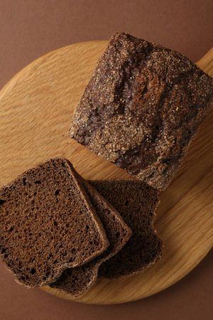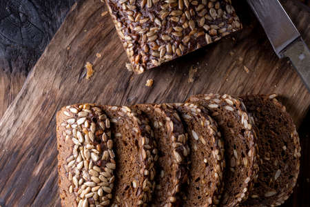 Sliced rye bread on cutting board. Whole grain rye bread with seeds.