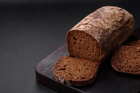 Delicious fresh crispy brown bread with grains and seeds on a dark concrete background