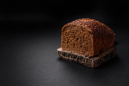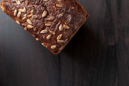 delicious fresh baked brown bread with bran sunflower seeds on a dark background, horizontal image