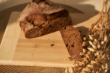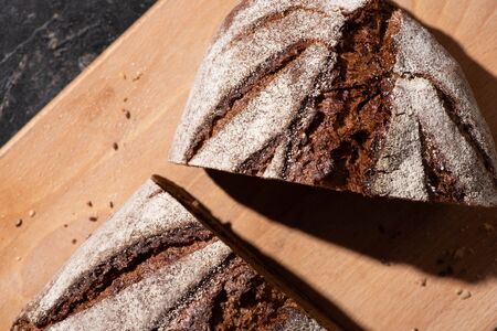Fresh, brown, freshly baked, multi-grain and yeast-free bread on a cutting board and cereals, cut off a piece of the bread separately and copy space. Sun lights and shadows. High quality photo