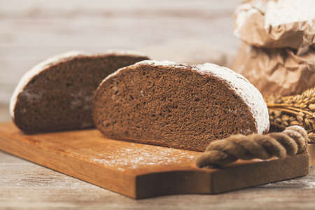 Sliced and whole ​​rye bread and ears of rye on a wooden rustic background
