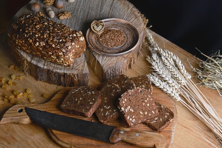 black sliced bread on the board, vintage knife, wheat shoots, flax seed, on the table and a wooden background on a stump, concept of healthy eating, set.