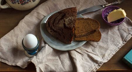 rye bread on a grey dish boiled egg in a stand and butter in a purple bowl