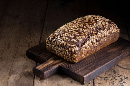 Delicious fresh baked bread with bran sunflower seeds on a dark table, horizontal image