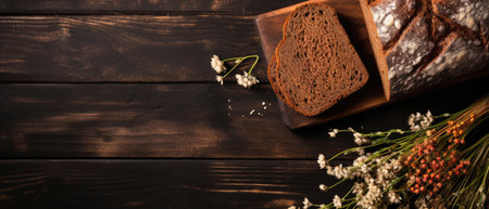 bread cutted on board from above. Kitchen or bakery poster design on dark.