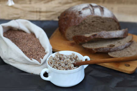 plate of oatmeal and sliced rye bread lie on a wooden table