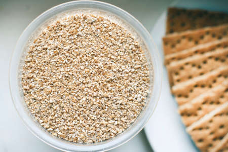 Bowl of buckwheat flakes on black background