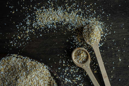 Oat flakes in Wooden bowl and spoon with oat on wooden table.