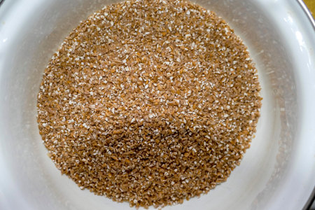 dry wheat groats from durum wheat in enameled dishes, most useful, contains vitamins, trace elements