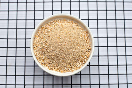 Bowl of wheat bran on white background. It is common ingredient of healthy meal.