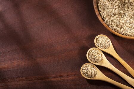 golden flaxseed meal - a ceramic bowl on grunge wood background with a copy space