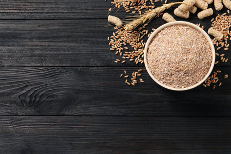 Bowl of wheat bran on black wooden table, flat lay. Space for text