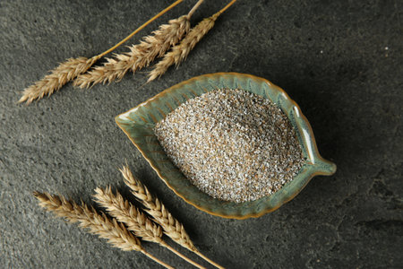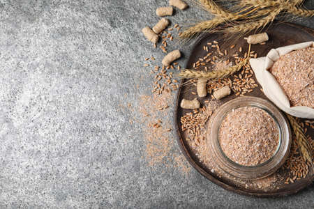 Fresh rye bran and spikelets on gray textured table, flat lay
