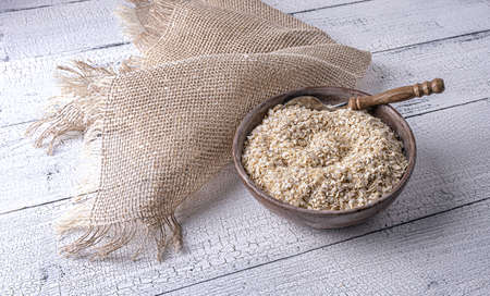 Oat bran rustic style in a wooden plate with a spoon, on a white wood background
