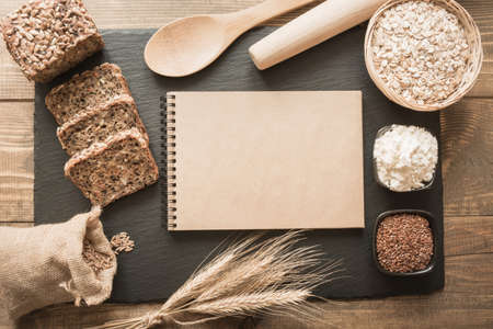 Empty blank for a recipe of bread with ingredients, flour, wheat, bread, rye, flax seeds around on a black slate dish.Top view and copy space.