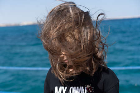 portrait of a little girl with fluffy hair near the sea