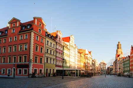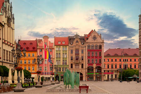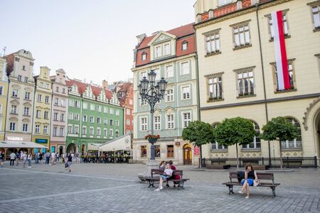 Wroclaw, July 2020: Exterior of colorful historical tenement houses at Old Market Square, the Old Town in Wroclaw, Lower Silesia. Tourism in Poland