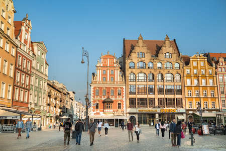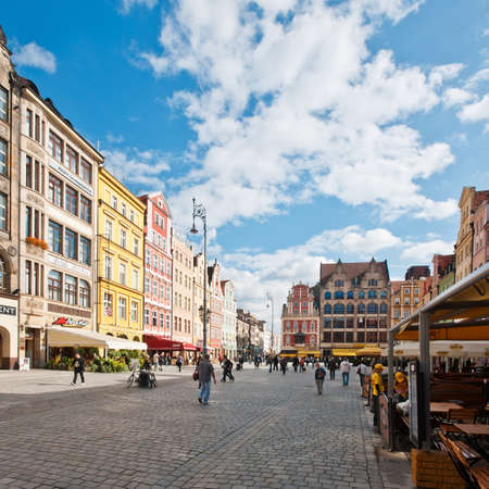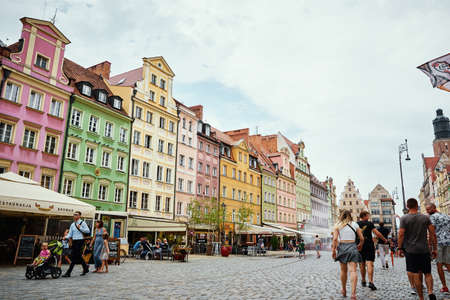 Wroclaw, Silesia, Poland - September,19th, 2016. Traditional colorful houses, tourist walkway and pavement at Wroclaw Old Town Market Square Rynek panoramic view. One of the famous city landmarks.