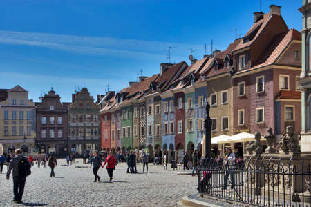 Poznan, Poland, April 30, 2018: Old Market sqaure in Poznan. Poland. Row of colorful old houses in the historical town square