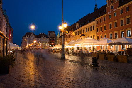 WROCLAW, POLAND-April 8, 2019: Evening View of the Market Square in the Old Town of Wroclaw. Wroclaw-the historical capital of Lower Silesia.