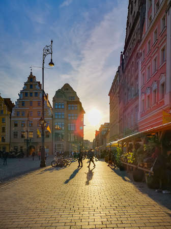 Wroclaw May 19 2018 sunset between old tenement houses at market square