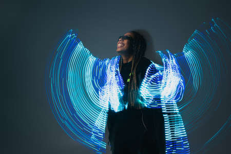 Enjoying listening music in headphones. In glasses. Futuristic neon lighting. Young african american man in the studio.
