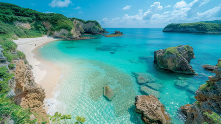 Lush greenery frames a pristine beach and turquoise waters in Okinawa, Japan