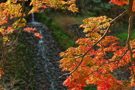 Nara,Japan-November 16, 2020: Maple tree with a small waterfall background