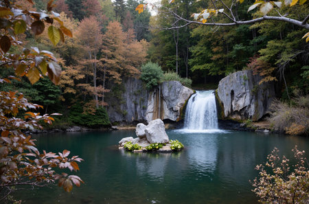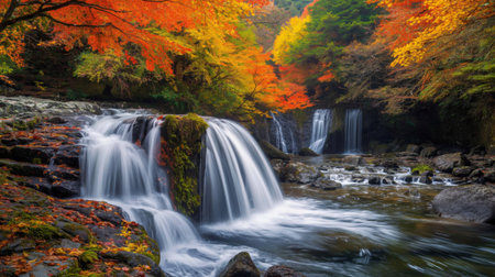 Captivating waterfall surrounded by vibrant fall foliage in a tranquil forest setting