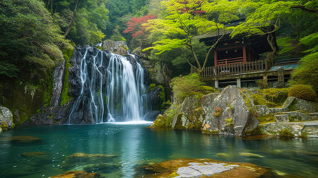 This stunning image captures a majestic waterfall flowing gently amidst blooming cherry blossom trees. The tranquil landscape reflects the beauty of nature in spring.