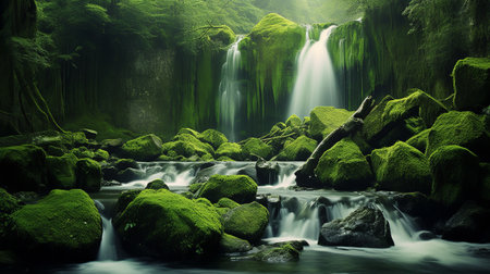 Misty waterfall cascading down a lush mountainside. Tranquil river flows through mossy rocks.