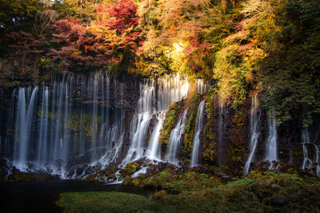 Beautiful scenery of Shiraito Waterfall in Karuizawa, Japan. The site is most beautiful in the fall, when the leaves change color creating a heavenly scene.
